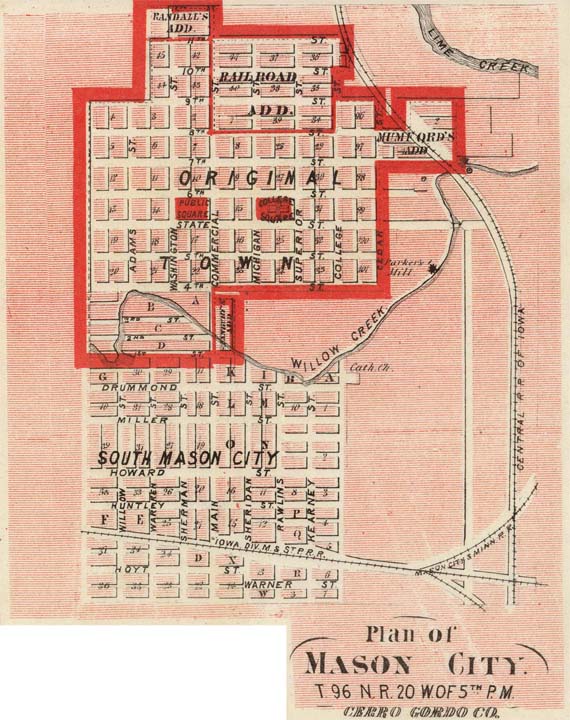 Plans for Mason City - 1875 Thanks to Jim Tait, who found this historical map on the internet. Larry Bednar adds the following information: "The map is a proposal of a future MC (a blueprint of MC submitted by a group of city planners), not an actual map. Some things on the map were already in place, but some were just proposals. And as we know, some of those proposals never came about and others were built and created in spots other than the ones proposed." Note that north-south streets became avenues and "Commercial Street" became Federal Avenue. As far as we know, plans for a Mason City college and College Square never materialized, but of course we now have the excellent North Iowa Area Community College. See current map of Mason City.